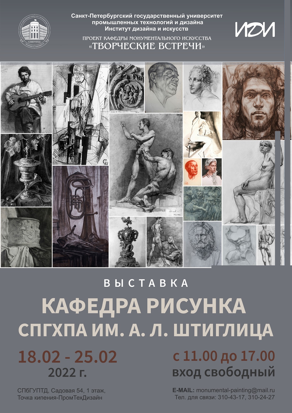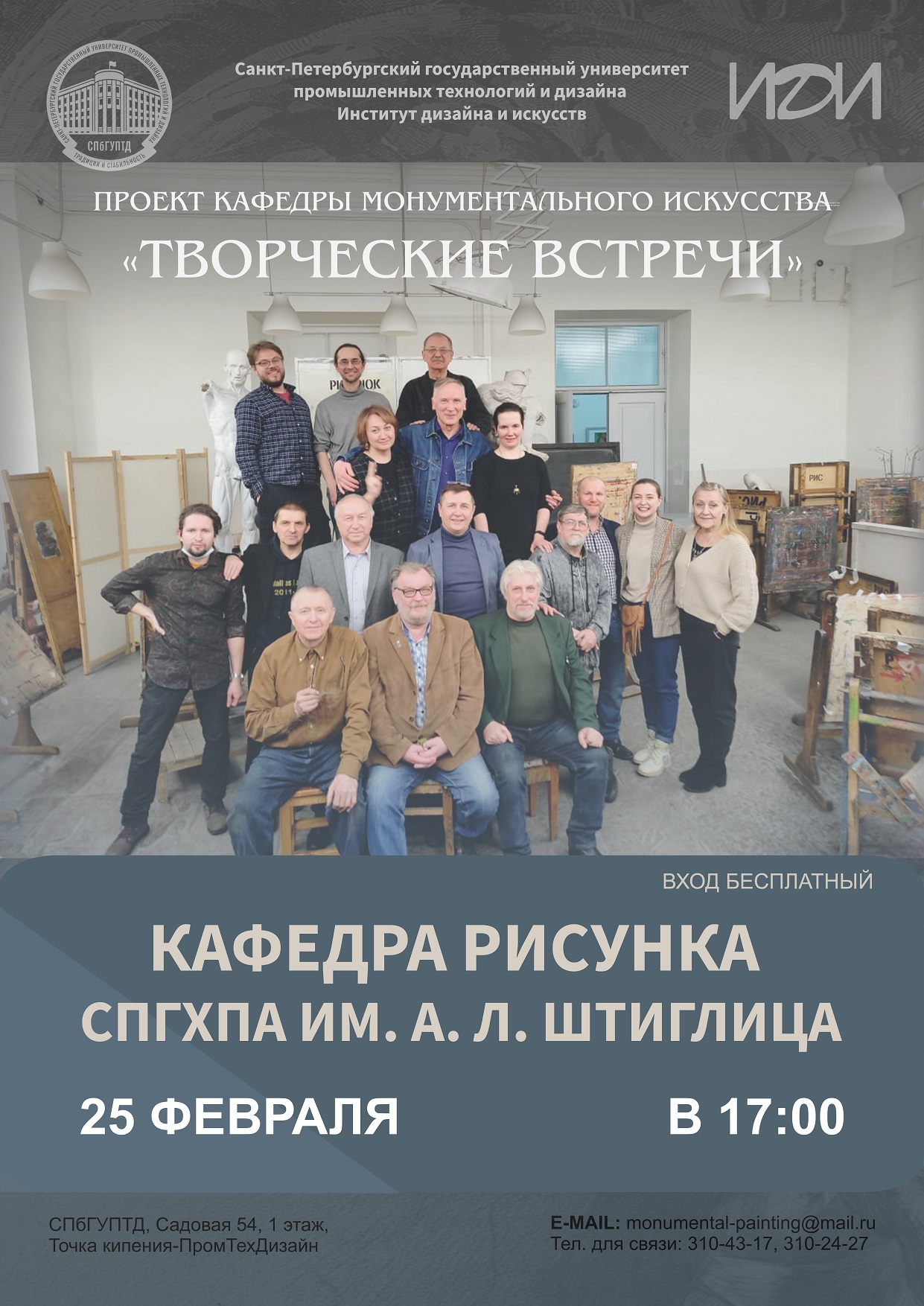 В рамках проекта «Творческие встречи» кафедры монументального искусства Института дизайна и искусств Санкт-Петербургского государственного университета промышленных технологий и дизайна, состоится пятый творческий вечер с преподавателями кафедры рисунка СПГХПА им. А.Л. Штиглица. Кафедра рисунка является одним из старейших подразделений академии, опирается в своем основании на традиции, заложенные еще преподавателями ЦУТР Барона А. Л. Штиглица. Нас познакомят с историей кафедры рисунка, основными периодами ее деятельности, методиками учебного рисования, спецификой преподавания рисунка для различных специальностей, особенностями ведения заданий.