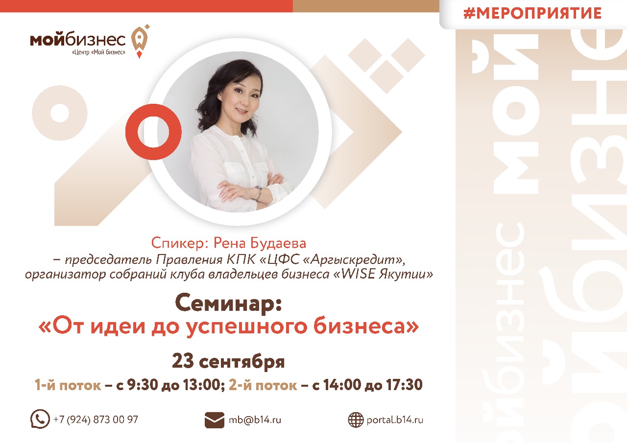 19 октября ГАУ РС (Я) «Центр «Мой бизнес» при Министерстве предпринимательства, торговли и туризма Якутии совместно с Точкой кипения СВФУ им. М.К. Аммосова приглашают на онлайн-семинар «ОТ ИДЕИ СОЗДАНИЯ ДО УСПЕШНОГО БИЗНЕСА»