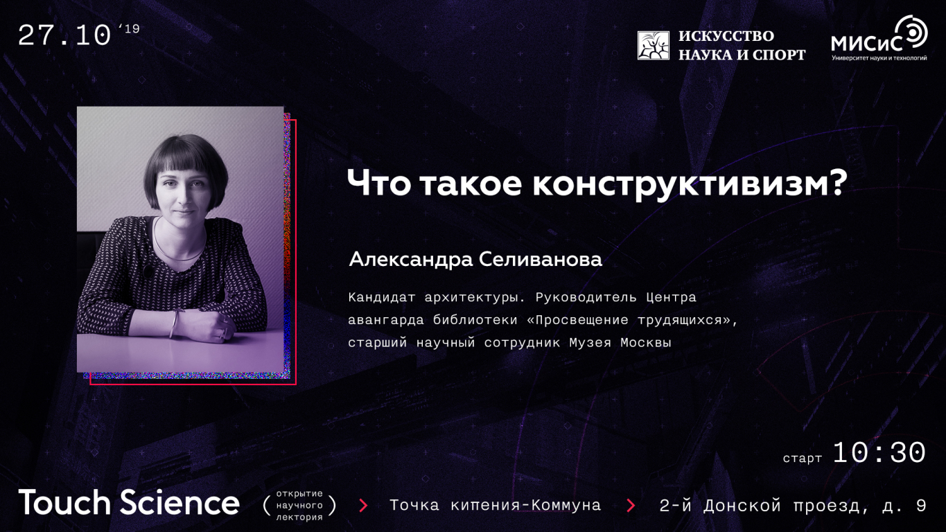 Александра Селиванова – Кандидат архитектуры. Руководитель Центра авангарда библиотеки «Просвещение трудящихся», старший научный сотрудник Музея Москвы.
