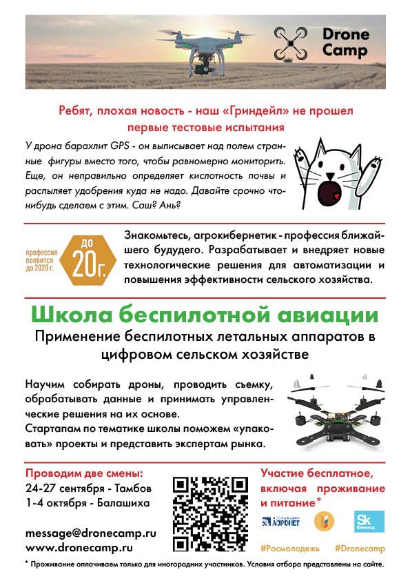 Пилотный запуск Drone camp посвящен приоритетному коммерческому сегменту рынка дорожной карты «Аэронет» – цифровому сельскому хозяйству. Эта отрасль быстро развивается и, согласно «Атласу новых профессий», до 2020 года появится новая профессия – агрокибернетик. Он будет разрабатывать и внедрять новые технологические решения для автоматизации и повышения эффективности сельского хозяйства, в том числе с использованием беспилотной авиации. Участники Drone camp одними из первых в России пройдут повышение квалификации по этой специальности.