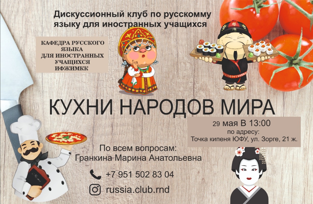 "Кухни народов мира" - это заключительная встреча дискуссионного клуба по русскому языку для иностранных учащихся в текущем учебном году. Интереснейшая программа ждёт участников!Помимо традиционных выступлений с презентациями всех будет жать развлекательная программа и дегустация блюд, приготовленных студентами!
