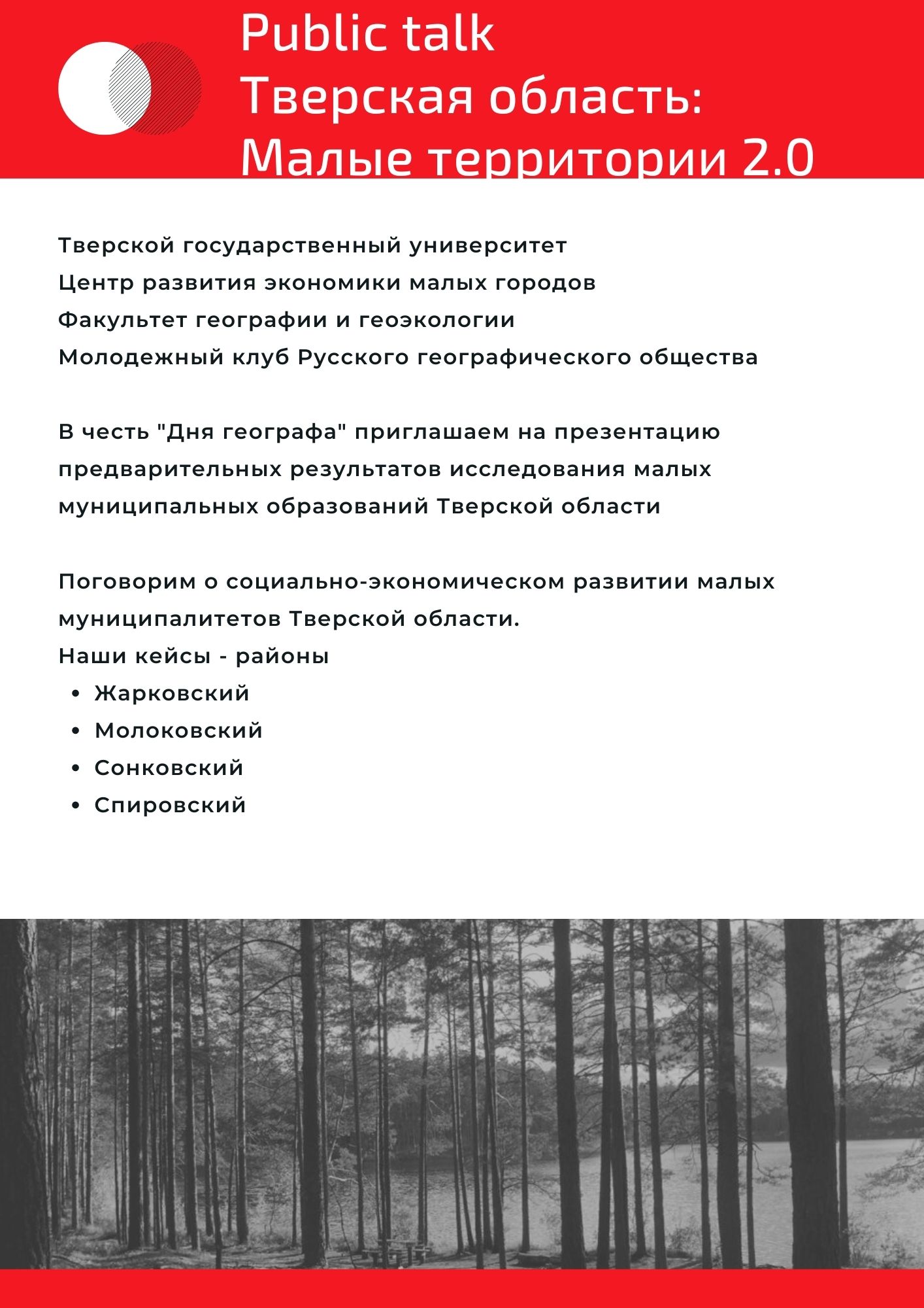 В честь Дня географа факультет географии и геоэкологии ТвГУ, Молодежный клуб ТРО РГО и Центр развития экономики малых городов проведут презентацию предварительных результатов исследований социально-экономического потенциала малых территорий Тверской области.