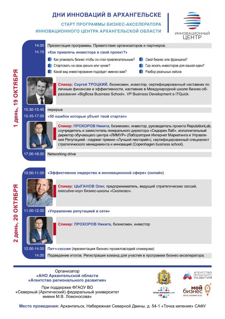 19-20 октября в «Точке кипения» САФУ состоится первый в Архангельской области венчурный акселератор для технологических проектов и стартапов Поморья, участникам расскажут, как создать с нуля технологичный стартап и привлечь инвестиции.