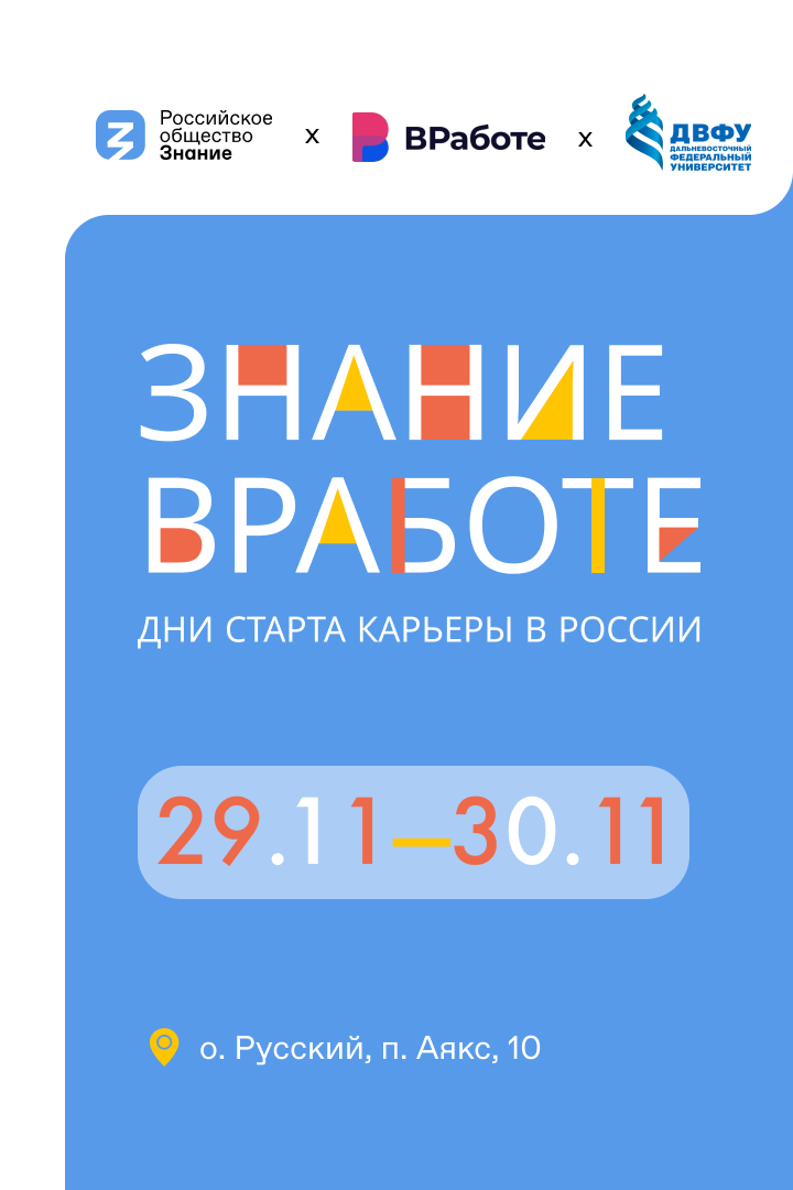 29 и 30 ноября Российское общество «Знание» и проект по развитию карьерного трека молодых специалистов «ВРаботе», при поддержке Дальневосточного федерального университета, проводят Студенческий карьерный форум «Знание ВРаботе».