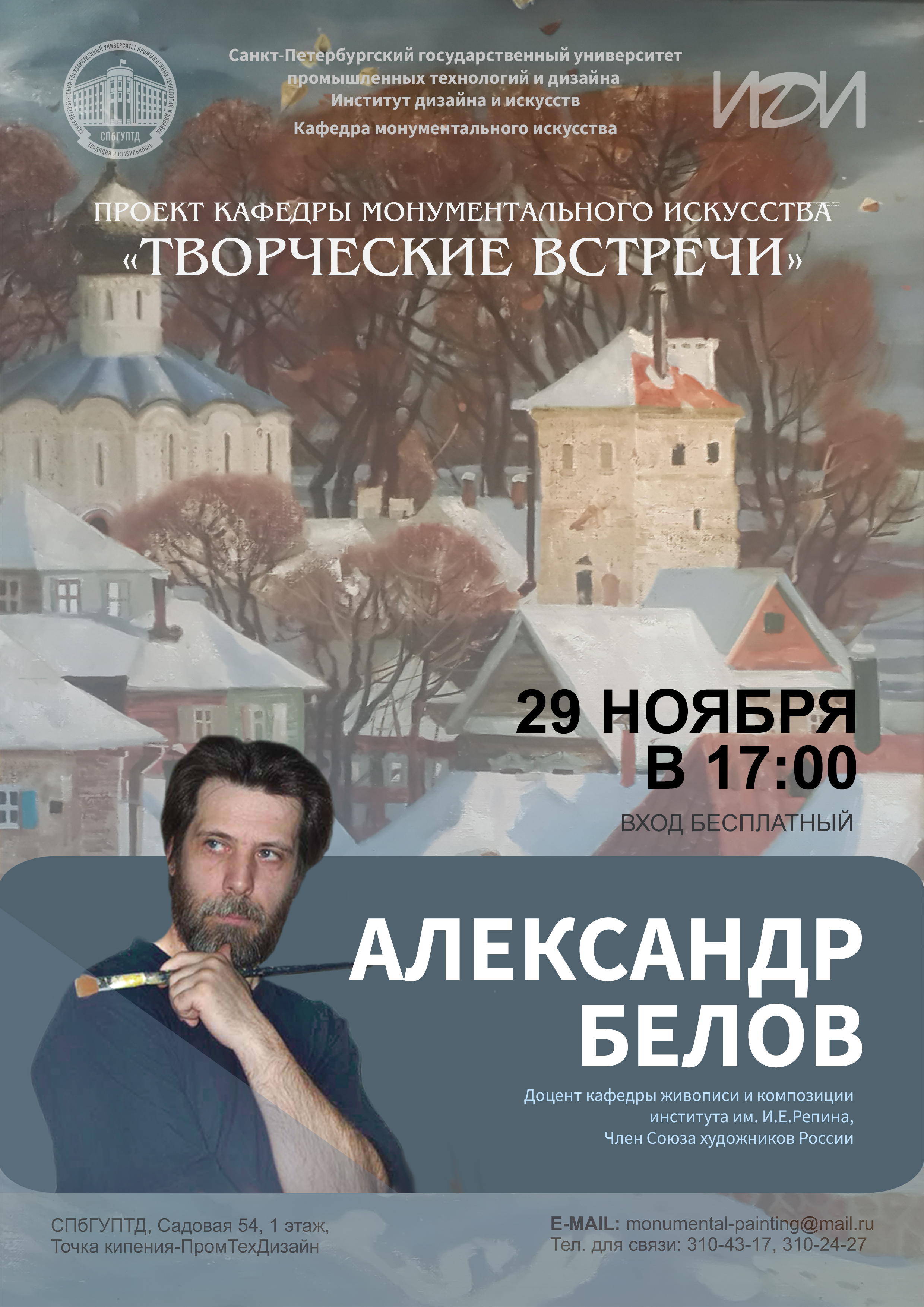 В рамках проекта «Творческие встречи» кафедры монументального искусства Института дизайна и искусств Санкт-Петербургского государственного университета промышленных технологий и дизайна, состоится третий творческий вечер с известным художником, членом Союза художников России, доцентом кафедры живописи и композиции Санкт-Петербургской Академии художеств имени Ильи Репина – Беловым Александром Владимировичем.