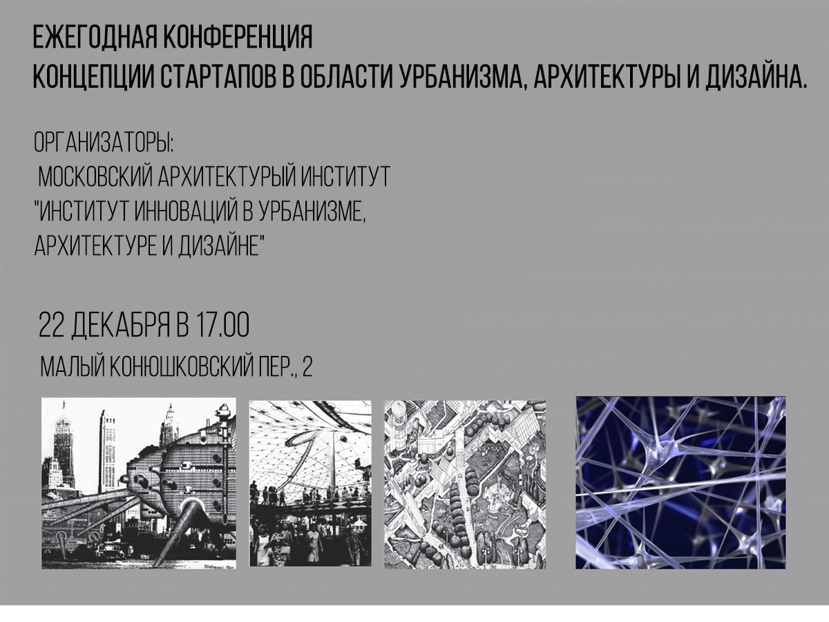 Ежегодно (с 2018г.) в декабре проводиться конференция концепций старапов в рамках единственного в стране спец. курса МАРХИ "Инновации в урбанизме, архитектуре и дизайне" , и в рамках концепции "Институализации инновационного развития в урбанизме, архитектуре и дизайне".