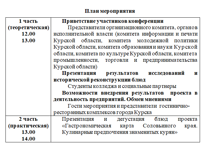 - историческая реконструкция и отработка блюд в условиях лаборатории колледжа коммерции, технологий и сервиса ФГБОУ ВО «Курский государственный университет»;