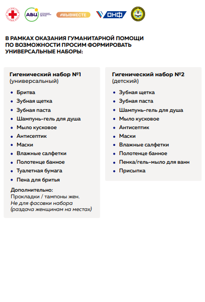 Приносить можно детское питание, средства по уходу за детьми и лежачими больными, постельное белье, гигиенические принадлежности, бытовую технику, средства индивидуальной защиты (маски и т.д.), одежду и канцелярские принадлежности.