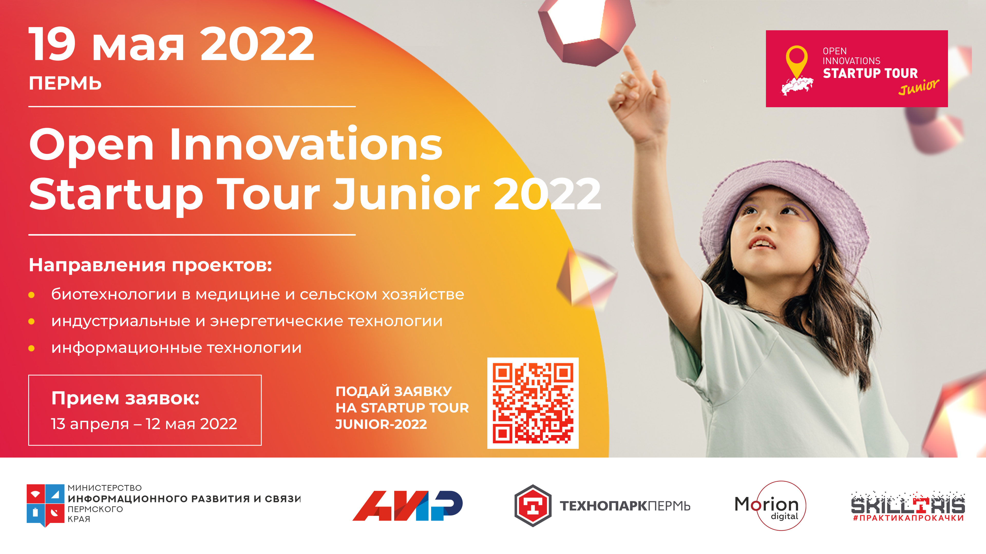 19 мая 2022 в Технопарке Пермь пройдет уникальный конкурс технологических проектов "Startup Tour Junior" - детский аналог ежегодного мероприятия Фонда "Сколково" "Open Innovations Startup Tour". Принять в нем участие могут все учащиеся общеобразовательных, средних и высших учебных заведений в возрасте от 7 до 18 лет включительно!