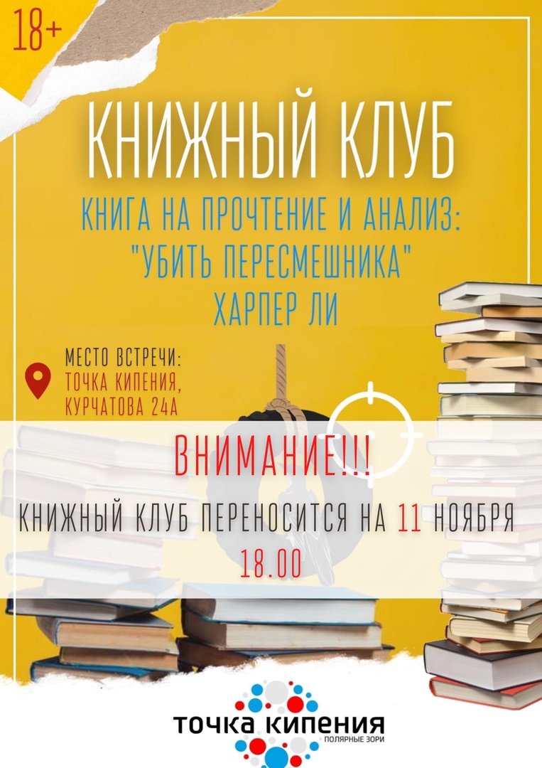Хотите взглянуть на мир глазами ребенка?А понять чистый детский разум, в котором нет места шаблонам, предрассудкам, вражде и ненависти? 🤍 Тогда приглашаем вас на следующую встречу Книжного Клуба 18+, где мы проанализируем и обсудим нашумевший роман-бестселлер американской писательницы Харпер Ли – «Убить пересмешника» Этот роман из той породы книг, что сдвигают горы, поворачивают реки вспять и меняют человеческие судьбы. Устами младенцев глаголет истина. В данном случае она, и только она, глаголет устами главной героини - восьмилетней Джин-Луизы Финч Эта книга о любви. Не о романтических отношениях, а о любви, которая просто должна быть в сердце каждого. И та, что противостоит всеобщей ненависти. Это произведение поднимает именно те проблемы, которые были и будут заслуживать внимания. Роман поднимающий нравственные вопросы: зла и добра, жестокости и справедливости, слабости и силы духа, подлости и совести.