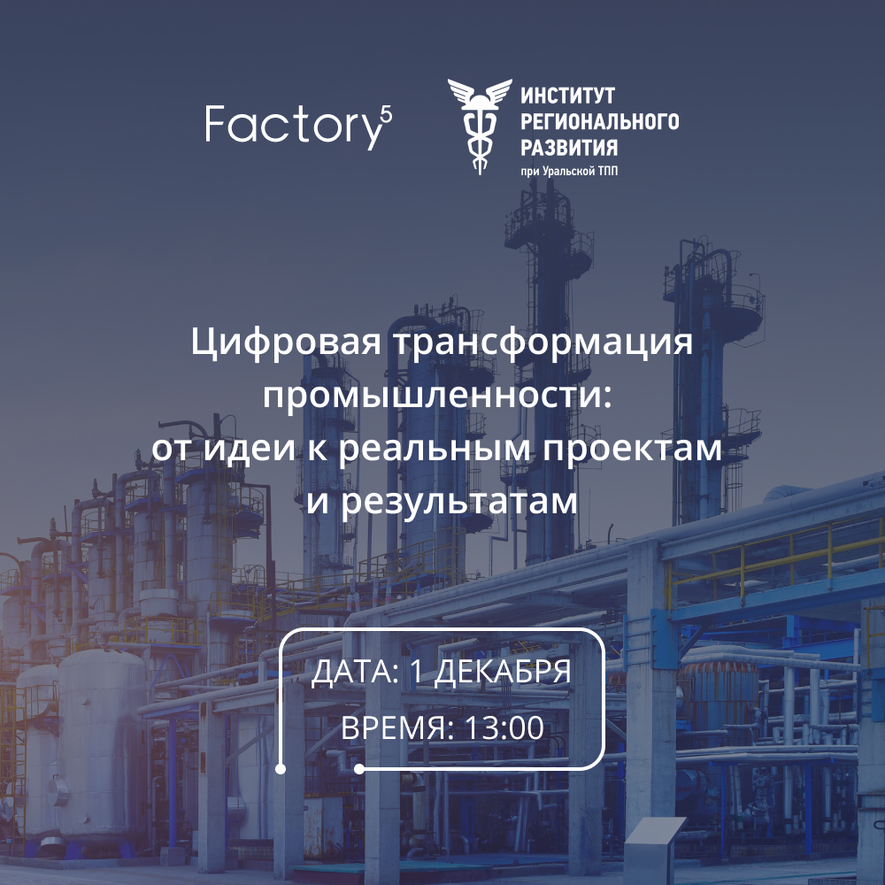 Институт регионального развития при Уральской ТПП и российский разработчик программного обеспечения Factory5 приглашают на вебинар «Цифровая трансформация промышленности: от идеи к реальным проектам и результатам».
