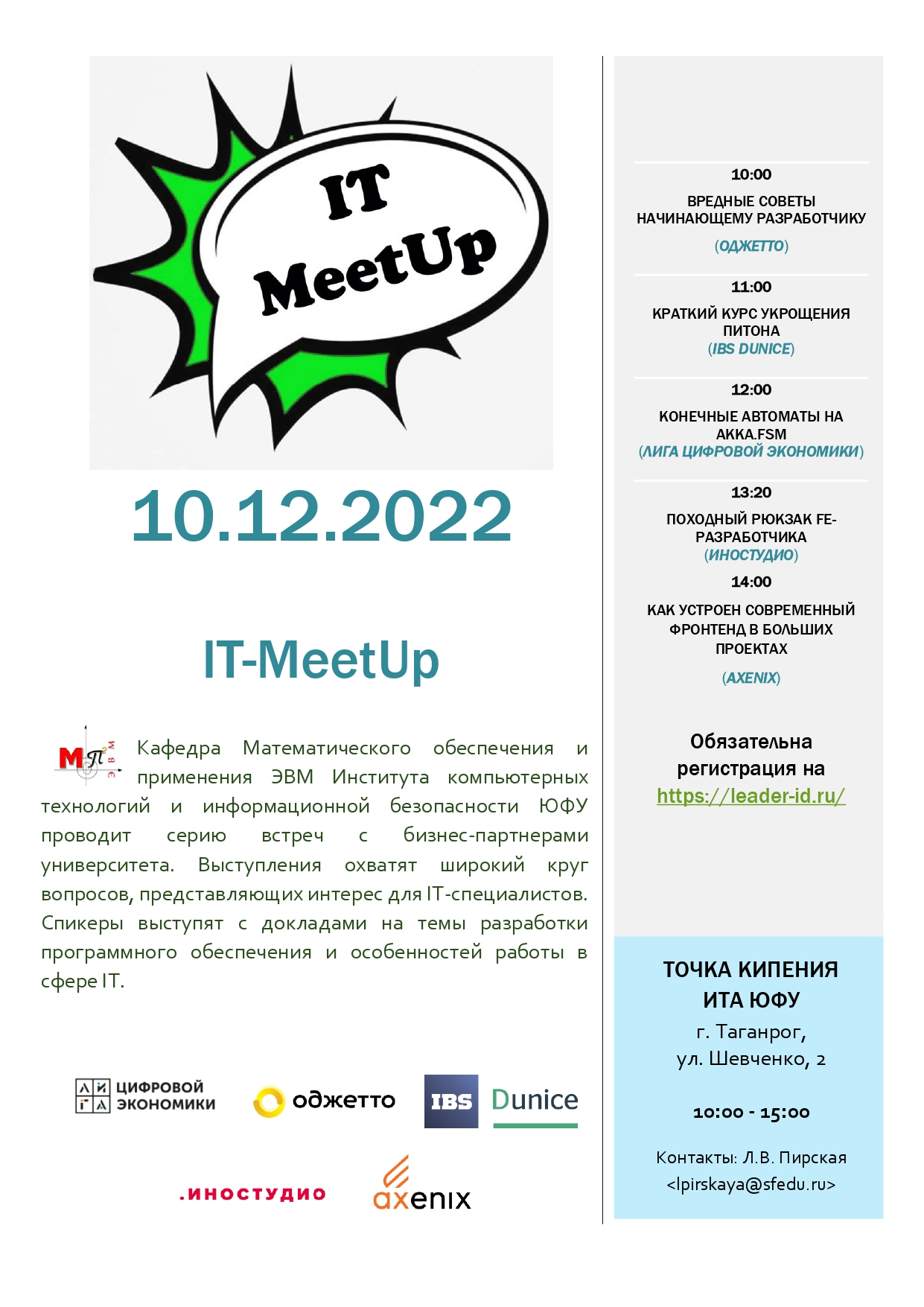 Кафедра Математического обеспечения и применения ЭВМ Института компьютерных технологий и информационной безопасности ЮФУ проводит серию встреч с бизнес-партнерами университета. Выступления охватят широкий круг вопросов, представляющих интерес для IT-специалистов. Спикеры выступят с докладами на темы разработки программного обеспечения и особенностей работы в сфере IT.