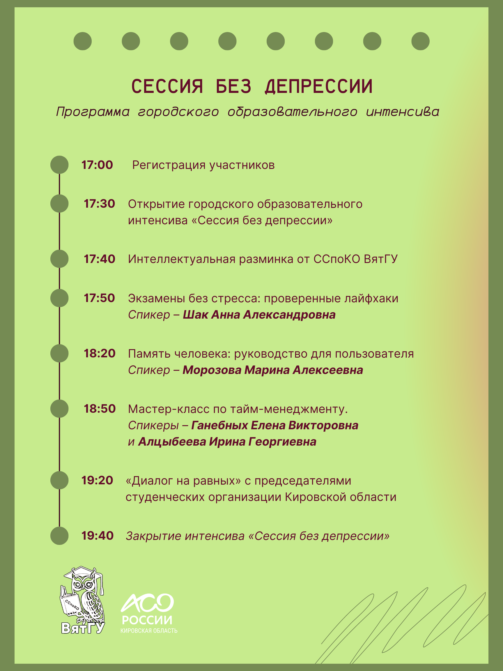 Студенческий Совет по качеству образования ВятГУ совместно с Ассоциацией студенческих объединений Кировской области приглашают на образовательный интенсив «СЕССИЯ БЕЗ ДЕПРЕССИИ», на котором: