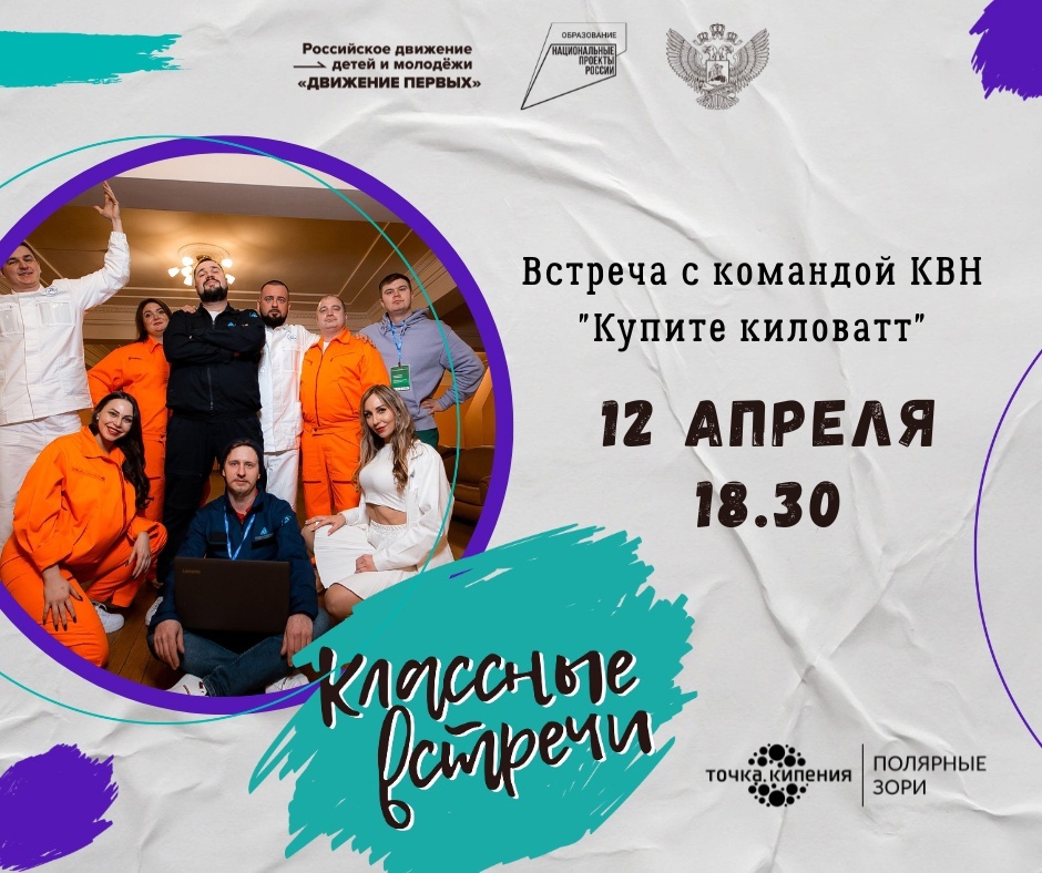 Мы уже писали о том, что присоединяемся к Всероссийскому проекту «Классные встречи» и запускаем серию мероприятий, на которых вы сможете пообщаться с интересными людьми, задать любой вопрос об их личной жизни, карьере и профессиональном успехе.На первую "Классную встречу" мы пригласили самых искрометных, самых веселых и находчивых - команду КВН "Купите киловатт"!Очень символично, что встреча с ребятами пройдет 12 апреля! Ведь именно в эту дату, ровно год назад, они впервые выступили в Фестивале Мурманской лиги КВН, и, спустя год, в этом же Фестивале заняли 3 место! Приглашаем всех желающих апреля в . в "Точку кипения"! Готовьте свои вопросы ребятам До встречи!