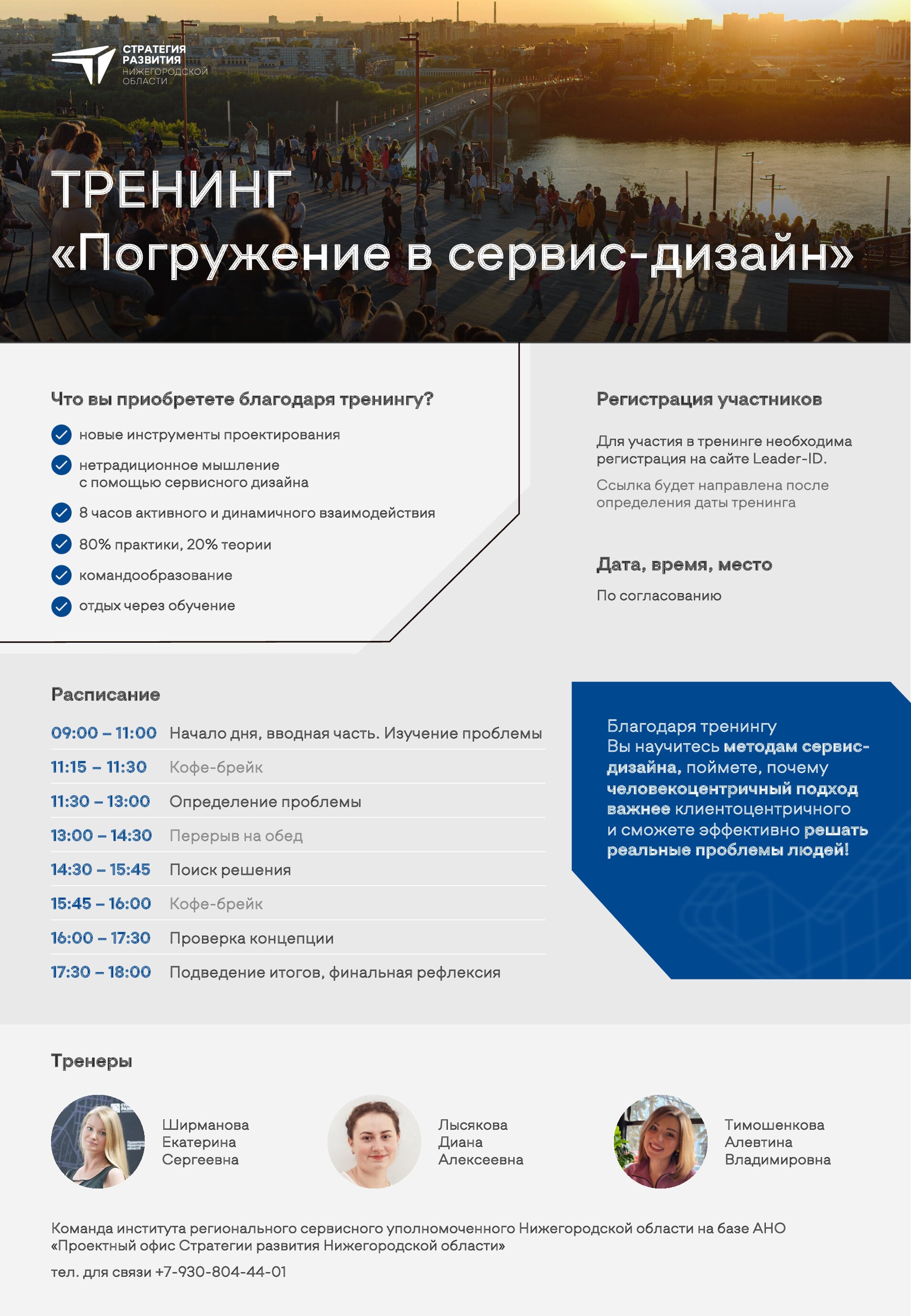 В рамках программы очного обучения Вы научитесь методам сервис-дизайна, поймете, почему человекоцентричный подход дополняет клиентоцентричный, и сможете эффективно решать реальные проблемы людей!
