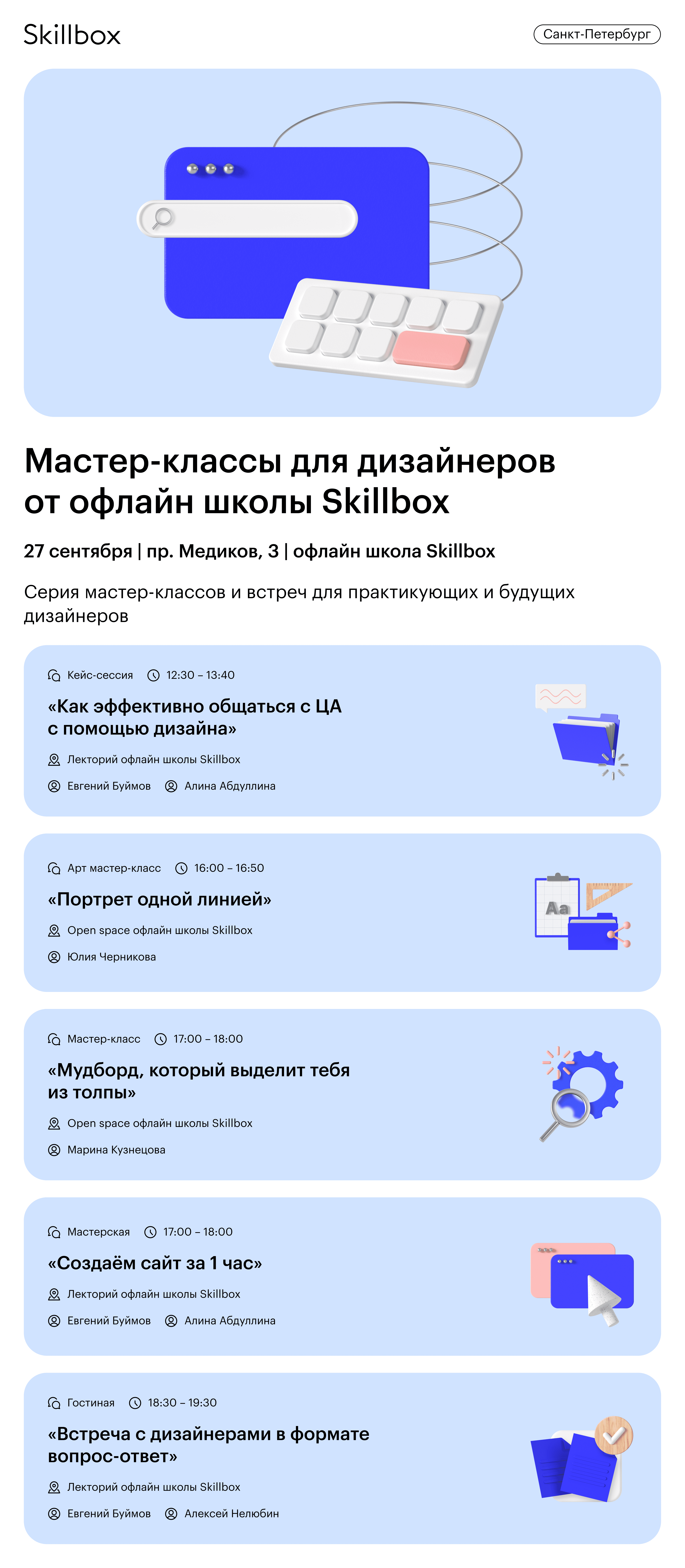 Место проведения: офлайн школа дизайна Skillbox, пр. Медиков, 3. Помещение Точки кипения - Санкт-Петербург. Этаж Н.