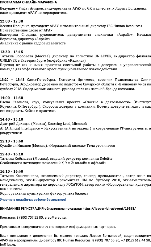 Контакты: 8 (800) 707 55 80, arau@arau.su. Ваши пожелания и дополнения Вы можете прислать Ларисе Богдановой, вице-президенту АРАУ по мероприятиям, директору IBC Human Resources: 8 (800) 707 55 80, +7 (912) 612 44 90, hr@ibc.ru.