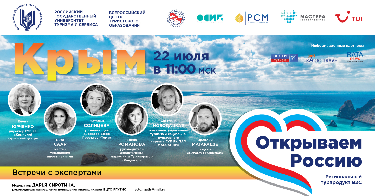 Российский государственный университет туризма и сервиса проводит серию летних вебинаров «Открываем Россию». Еженедельно вас ждут незабываемые путешествия по нашей стране. Цель – показать турпродукт регионов России в формате B2C для широкой аудитории.