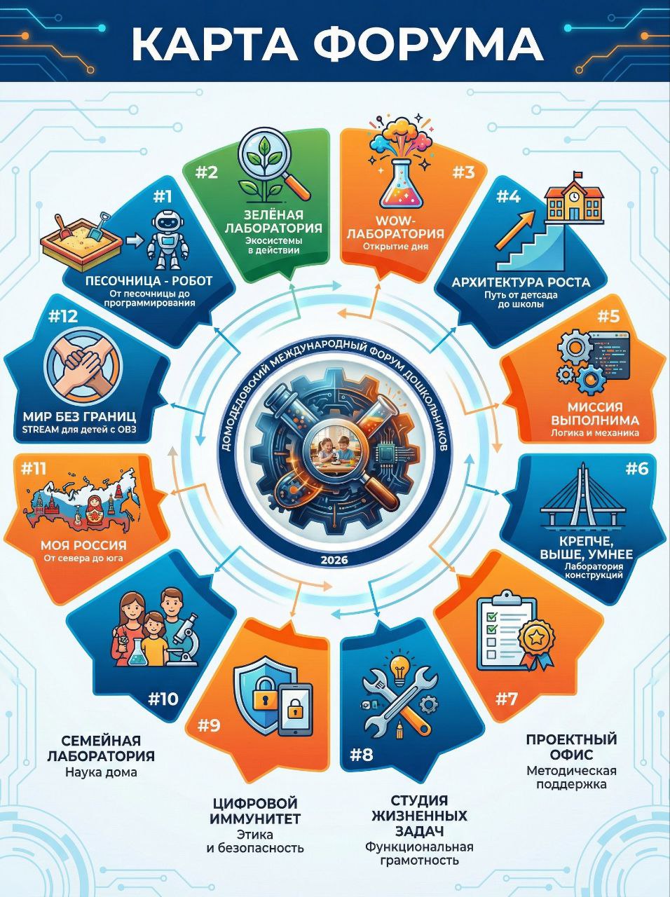 Там, где соединяются теория и практика, игра и исследование, детский восторг и профессиональный опыт. Приглашаем вас на уникальное событие - 2 дня погружения в современный мир дошкольного образования. В первый день 12 тематических площадок создадут живой портрет современного ребёнка: конструктора, эколога, учёного, инженера и гражданина цифрового мира. Второй день - выездные площадки- реальные ЭКОСИСТЕМЫ ДЕТСКОГО РОСТА.