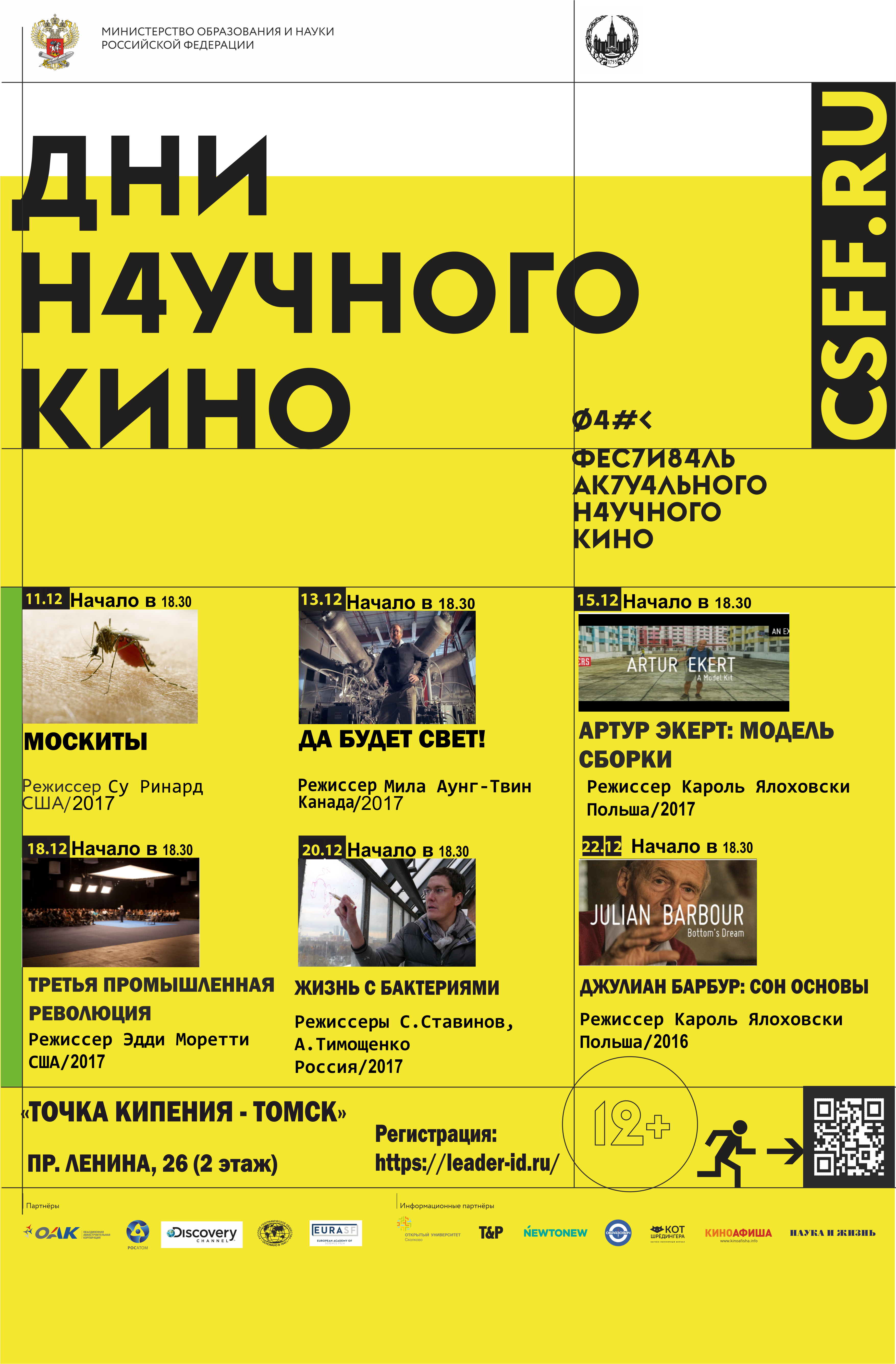 Дни научного кино – это открытый просветительский проект Фестиваля актуального научного кино. Вместе с партнерами мы собрали лучшие документальные фильмы о науке, выдающихся открытиях, жизни великих ученых и сделали их доступными для российских студентов. В рамках Дней научного кино в «Точке кипения – Томск» состоятся показы фильмов, разбирающих основные проблемы рынков будущего Национальной технологической инициативы – EnergyNet, HealthNet и т.д., а также «сквозных» цифровых технологий (включая квантовую криптографию). Отдельное внимание будет уделено передовому краю современных научных областей – физике, микробиологии, вирусологии, истории науки. В фильмах обсуждаются вызовы новой промышленной революции и предпринимается попытка переосмыслить текущие экономические модели.