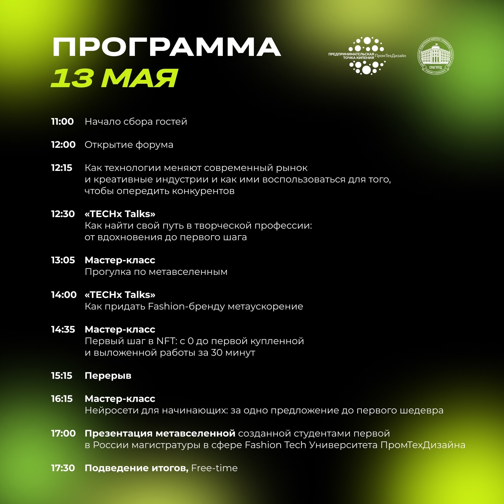 Нейросети, NFT, метавселенные, 3D печать, AR, VR - эти инструменты помогут вам создавать и продвигать уникальные проекты в области моды, дизайна, искусства, рекламы, музыки и кино. Мы приглашаем пообщаться с экспертами и практиками, получить ответы на вопросы о том, как использовать цифровые технологии в работе, а также как с их помощью продвигать свой бренд!
